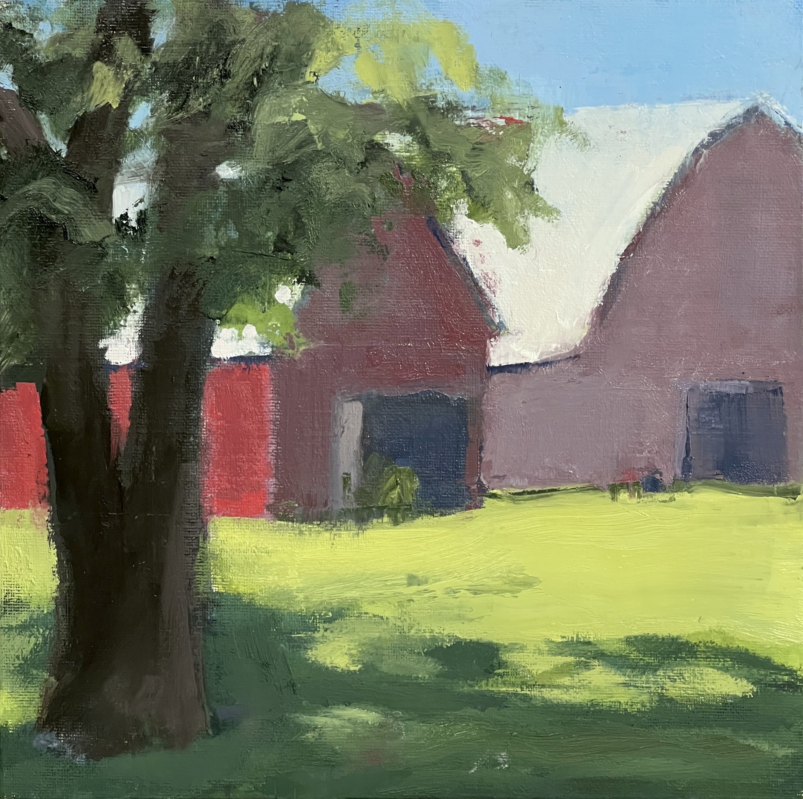 Two Barns, 10 x 10 oil on panel (2026)